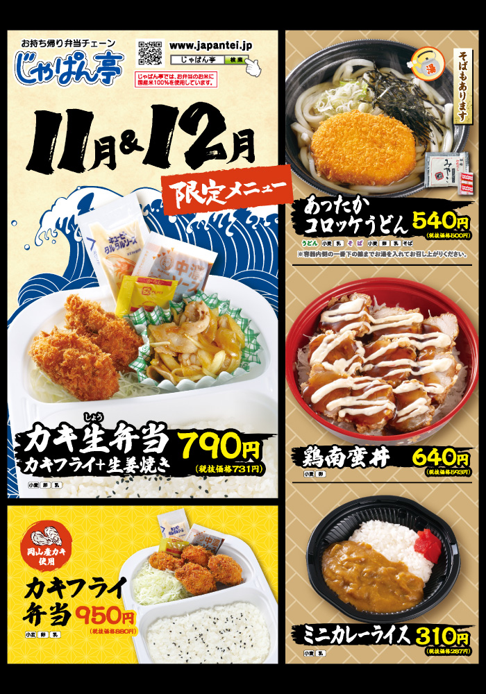 コンテンツ CONTENTS ホーム コンテンツ 11月&12月の限定メニュー! 2025.11.07 11月&12月の限定メニュー! スタッフブログ 一気に寒くなってきましたね! 春と秋が短く感じます。。。 11月と12月の限定メニューのご紹介です。 カキ生弁当 : 790円 カキフライ弁当 :950円 あったかコロッケうどん : 540円 鶏南蛮丼 : 640円 ミニカレー :310円 皆様のご来店をお待ちしております! 一覧へ戻る